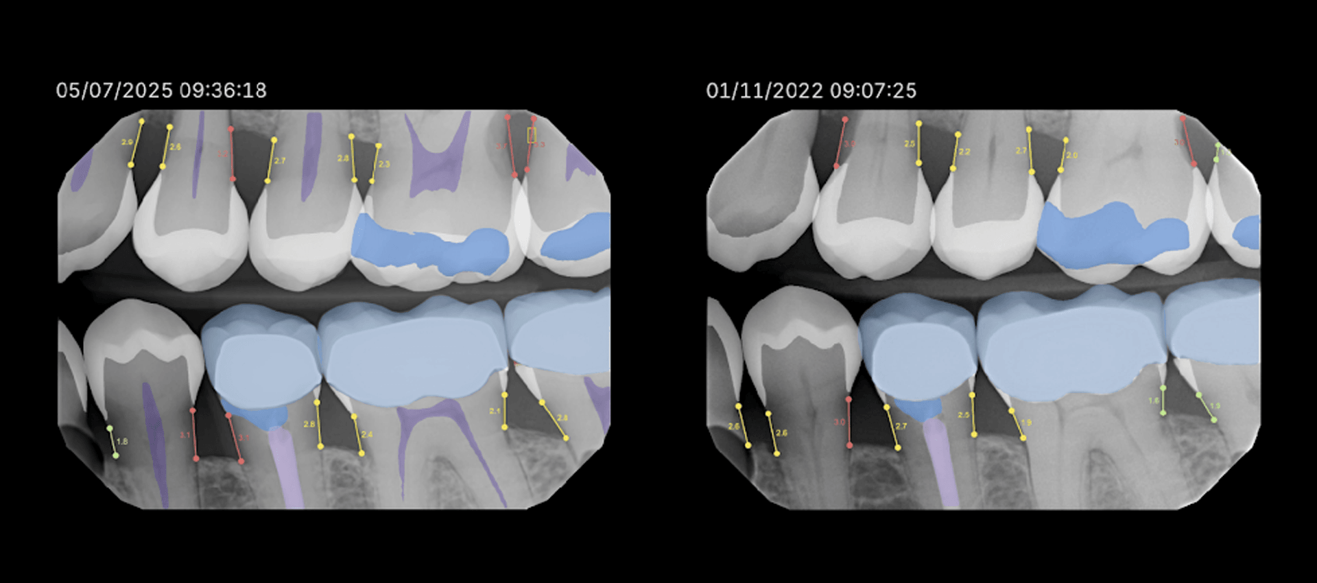 AI fills that gap. By measuring bone levels from consistent anatomical landmarks like the cementoenamel junction, AI provides precise, reproducible data that allows clinicians to track small changes with confidence. What might look “the same” visually can, through measurement, reveal a clear trend.