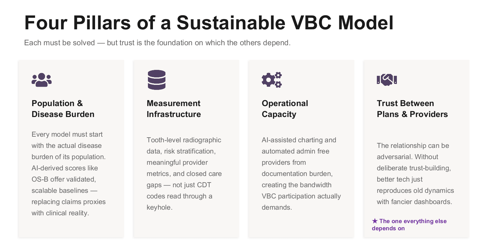 AI, deployed with these principles in mind, is the fastest path to that future. Not because it solves the relationship problem directly, since it does not, but because it provides the consistent, auditable, interest-neutral foundation that a trustworthy relationship requires. A shared source of truth is not sufficient for trust. But without one, trust in dental VBC will remain fragile, episodic, and dependent on the goodwill of individual leaders rather than embedded in the structure of the model itself.